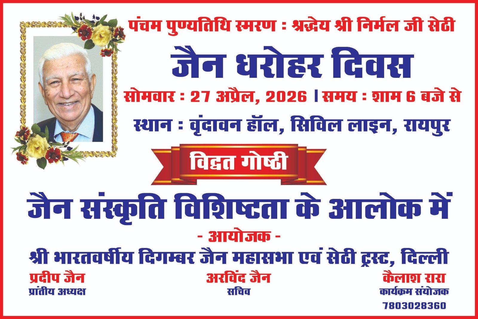 रायपुर (विश्व परिवार)। रायपुर में जैन समाज द्वारा 27 अप्रैल 2026, सोमवार को ‘जैन धरोहर दिवस’ के अवसर पर एक विशेष विद्वत गोष्ठी का आयोजन किया जा रहा है। यह कार्यक्रम श्रद्धेय श्री निर्मल जी सेठी की पंचम पुण्यतिथि के स्मरण में आयोजित होगा।