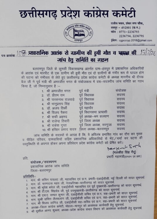 बलरामपुर (विश्व परिवार)। बलरामपुर जिले के कुसमी विकासखंड अंतर्गत ग्राम हंसपुर में एक ग्रामीण की कथित प्रशासनिक मारपीट से मौत और दो अन्य के गंभीर रूप से घायल होने के मामले ने राजनीतिक तूल पकड़ लिया है। घटना को गंभीरता से लेते हुए छत्तीसगढ़ प्रदेश कांग्रेस कमेटी ने 10 सदस्यीय जांच समिति का गठन किया है।