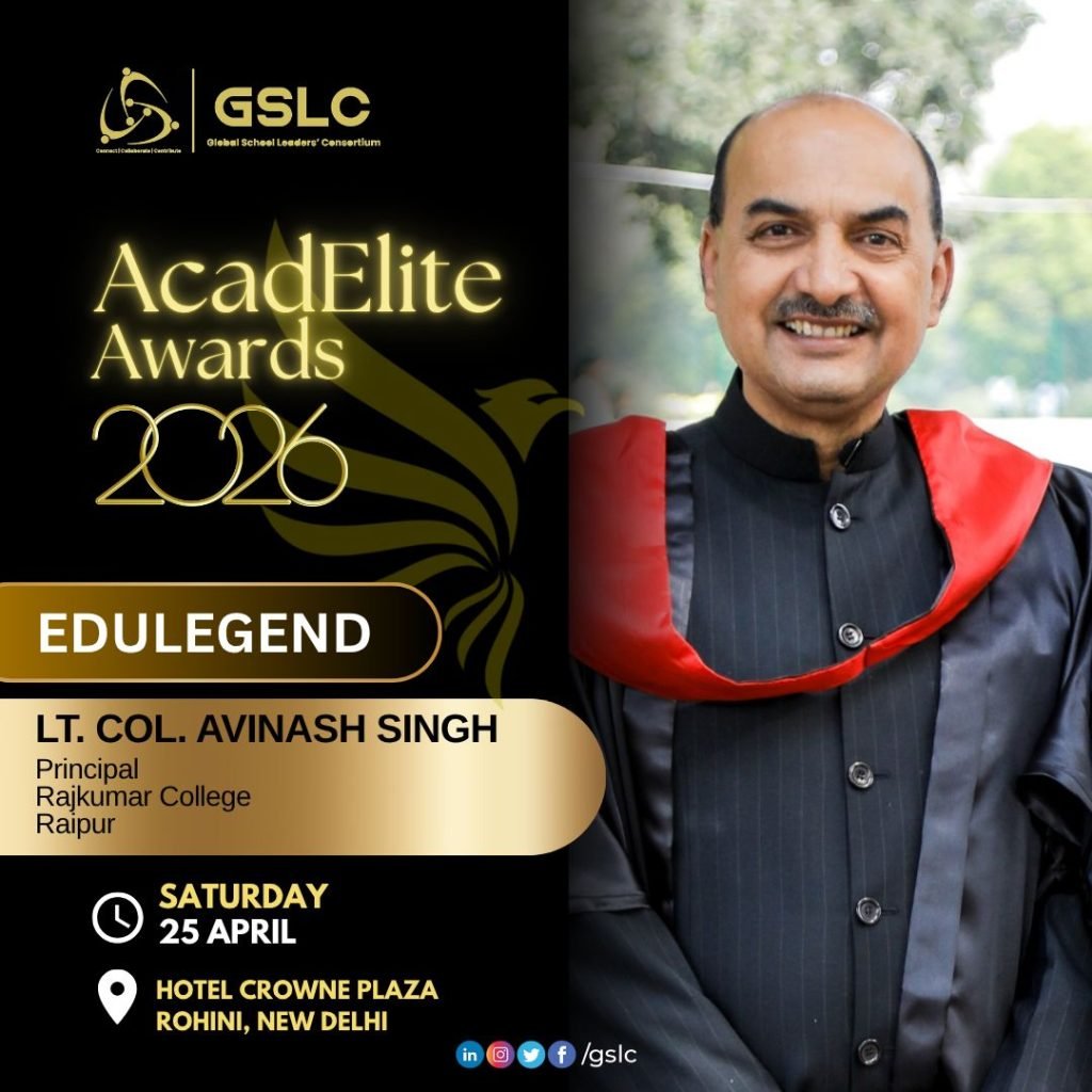 रायपुर (विश्व परिवार)। राजधानी रायपुर स्थित राजकुमार कॉलेज के प्रिंसिपल लेफ्टिनेंट कर्नल अविनाश सिंह (पूर्व सैनिक) को जीएसएलसी एकेडएलीट अवॉर्ड्स 2026 में ‘एजूलिजेंड’ सम्मान से नवाजा गया है। यह सम्मान उन विशिष्ट लीडर्स को दिया जाता है, जिनका जीवन समर्पण, अनुशासन और पीढ़ियों पर सकारात्मक और परिवर्तनकारी प्रभाव का प्रतीक माना जाता है।