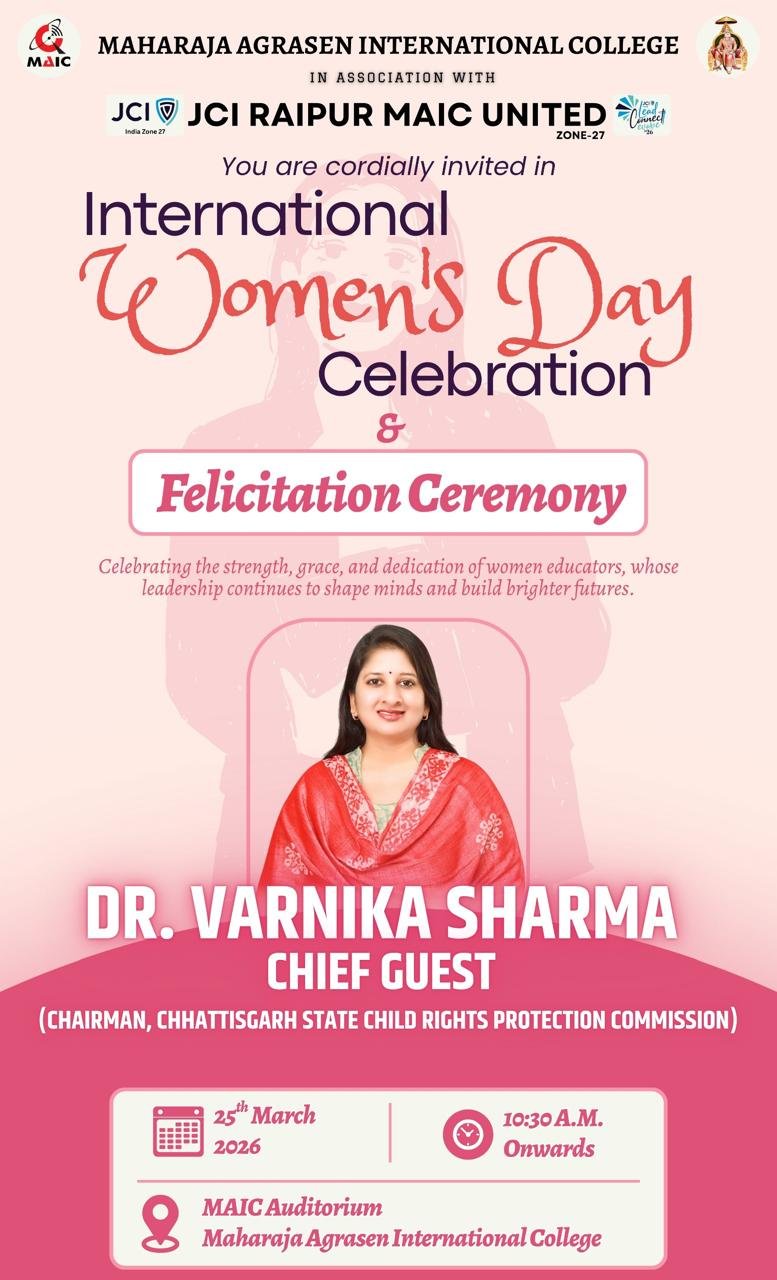 रायपुर (विश्व परिवार)। अंर्तराष्ट्रीय महिला दिवस के अवसर पर महाराजा अग्रसेन इंटरनेशनल कॉलेज, रायपुर द्वारा जे.सी.आई. रायपुर मैक यूनाइटेड (जोन-27) के सहयोग से एक भव्य “अंतरराष्ट्रीय महिला दिवस पर सम्मान समारोह” का आयोजन किया जा रहा है। यह कार्यक्रम 25 मार्च 2026 को प्रातः 10ः30 बजे से महाविद्यालय के ऑडिटोरियम में आयोजित होगा।