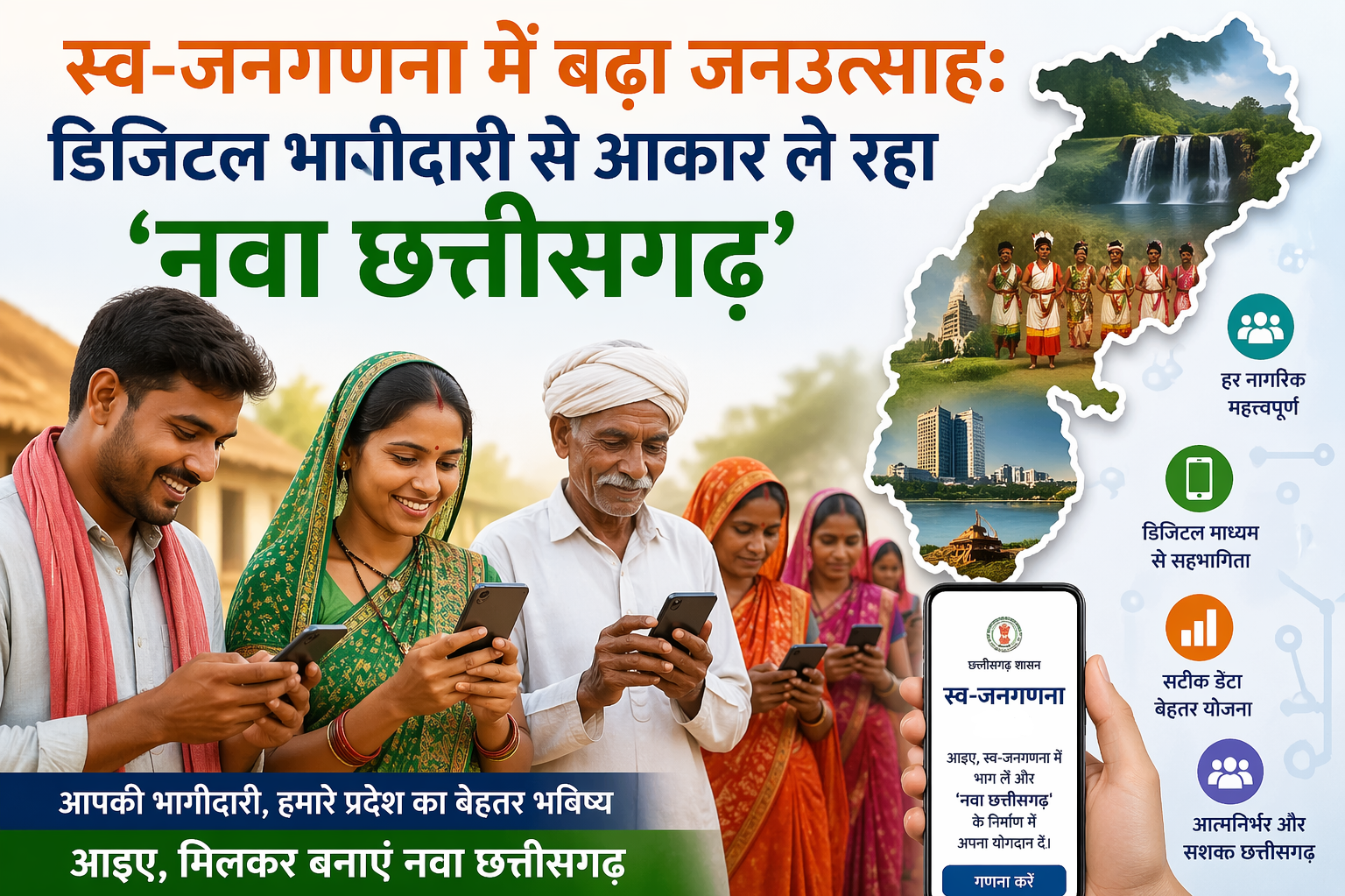 प्रशासन ने किसी भी शंका के समाधान के लिए टोल-फ्री नंबर 1855 जारी किया है। याद रखें, जनगणना में आपकी सही भागीदारी ही ‘गढ़बो नवा छत्तीसगढ़’ के सपने को साकार करेगी। अब जबकि स्व-जनगणना की प्रक्रिया शुरू हो चुकी है और नागरिक सक्रिय रूप से इसमें भाग ले रहे हैं, यह डिजिटल महाअभियान राज्य के विकास की नई दिशा तय करने की ओर बढ़ रहा है।