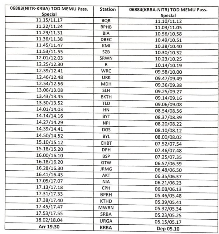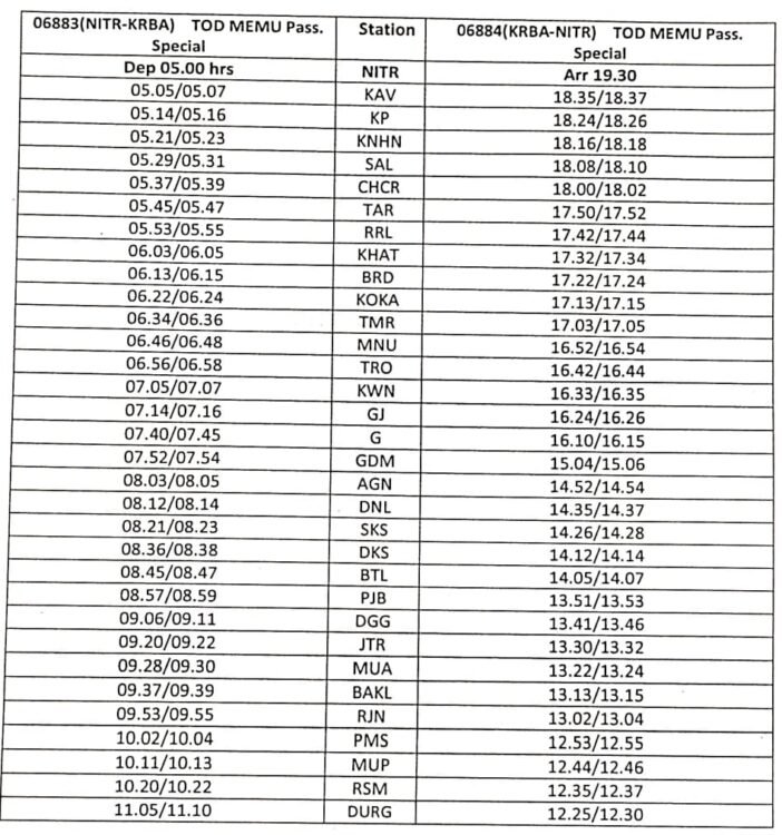 - कोरबा-नेताजी सुभाष चंद्र बोस(इतवारी)-कोरबा के मध्य चैत्र नवरात्रि मेला मेमू पैसेंजर स्पेशल ट्रेन का परिचालन