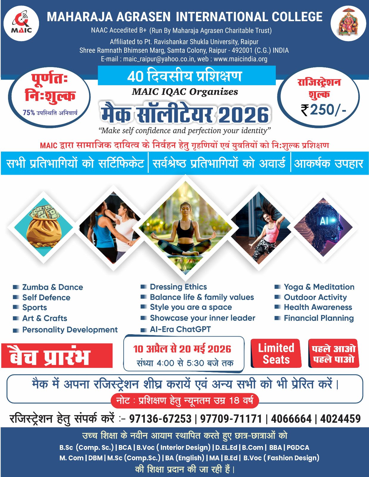 यह कार्यक्रम दिनांक ’’10 अप्रैल से 20 मई 2026’’ तक प्रतिदिन ’’सायं 4:00 बजे से 5:30 बजे तक’’ आयोजित किया जाएगा। पंजीकरण शुल्क ₹250 निर्धारित किया गया है तथा सीटें सीमित हैं, इसलिए इच्छुक प्रतिभागियों से शीघ्र पंजीकरण कराने का आग्रह किया गया है।