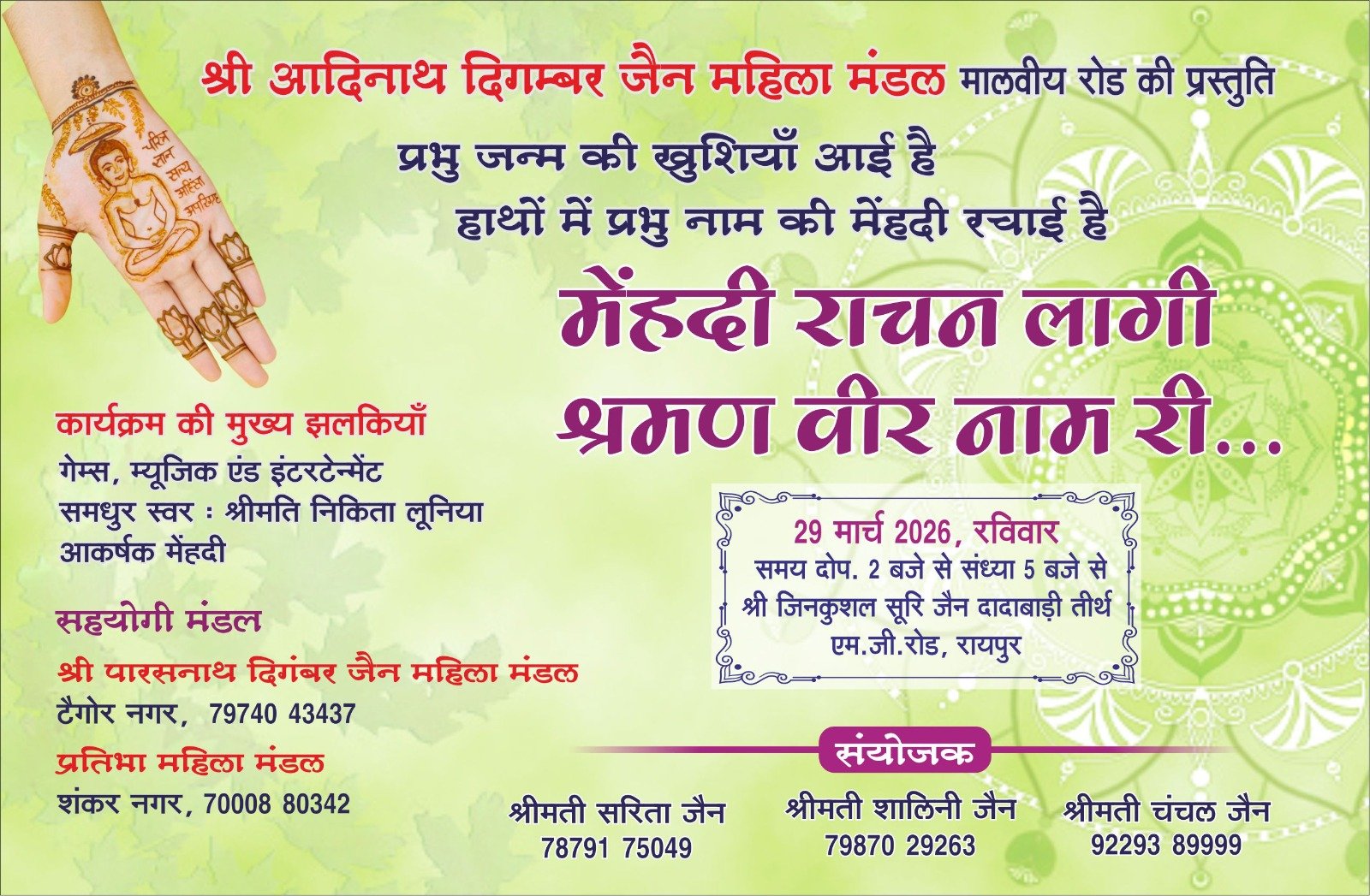रायपुर (विश्व परिवार)। श्री आदिनाथ दिगंबर जैन महिला मंडल, मालवीय रोड द्वारा प्रभु भगवान महावीर जन्मोत्सव के उपलक्ष्य में “मेहंदी राचनी लागी श्रमण वीर नाम री” सांस्कृतिक कार्यक्रम का आयोजन 29 मार्च 2026, रविवार को दोपहर 2 बजे से सायं 5 बजे तक श्री जिनकुशल सूरी जैन दादाबाड़ी तीर्थ, एम.जी. रोड, रायपुर में किया जाएगा।