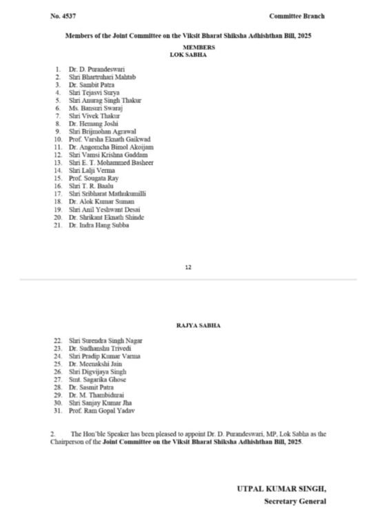 - ‘विकसित भारत शिक्षा अधिष्ठान विधेयक, 2025’ पर गठित JPC में सांसद बृजमोहन अग्रवाल