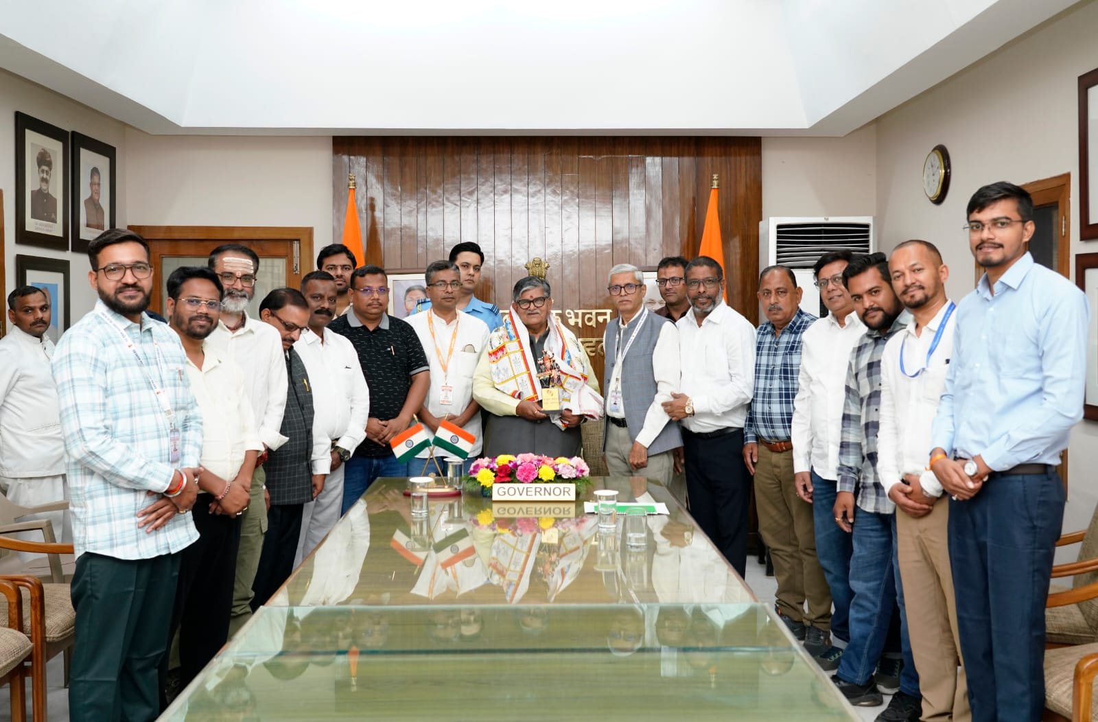 इस अवसर पर छत्तीसगढ़ के मीडिया प्रतिनिधिमंडल की ओर से राज्यपाल महोदय को छत्तीसगढ़ की पारंपरिक पहचान का प्रतीक गमछा एवं बस्तर कला से निर्मित स्मृति चिन्ह भेंट कर सम्मानित किया गया।