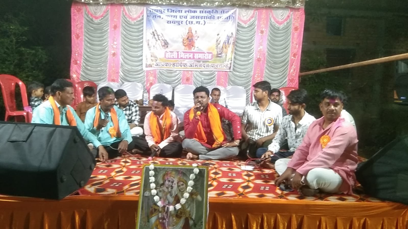 सर्वप्रथम उपस्थित सभी लोगो के द्वारा श्री राधेकृष्ण जी का पूरे विधि विधान से पूजा अर्चना की गई ततपश्चात समस्त अतिथियों ,गुरुजनों,पदाधिकारीयो,सदस्यों एवं कालकारो का ससम्मान स्वागत किया गया,संगीतमय होली मिलन कार्यक्रम का शुभारंभ समिति के अध्यक्ष शंकर लाल विश्वकर्मा ने सुमरनी गाकर किया साथ ही कार्यक्रम का संचालन समिति अध्यक्ष शंकर लाल विश्वकर्मा व मीडिया प्रभारी डोमन यादव में किया मंच के माध्यम से छत्तीसगढ़ के सुप्रसिद्ध जस,भजन एवं फाग गायक अमन बघेल जी ने बहुत ही मनमोहक व धमाकेदार प्रस्तुति दिया जिससे पूरा मंदिर परिसर में उपस्थित भक्तगण आनंदित हो उठे साथ ही पूरा माहौल भक्तिमय के रंग में रंग गया ,रायपुर जिला समिति के पूर्व अध्यक्ष रामाधार सारथी ने भी होली के महत्व को बताते हुए अपने मधुर आवाज से कई मनमोहक प्रस्तुति दी इसी क्रम में छोटे दुकालू के नाम से प्रसिद्ध भाई अनित साहू ने भी अपनी सुरीली तान छेड़ी एवं सभी को अपने गीतों से मंत्रमुग्ध कर दिया इसके अलावा रायपुर जिला के उपाध्यक्ष किरण जी ने भी अपनी सुमधुर सुरीली आवाज से भजनों एवं फागगीतों की मनमोहक प्रस्तुति दी साथ ही डोमन यादव,हरीश धीवर,संदीप धीवर, नितिन अग्रवाल,सुरेश सारथी,जानी धीवर ,दुर्गेश साहू ,निखिल भाई,स्थानीय मण्डली टिकरापारा के भाइयों ने भी बहुत ही जबरदस्त फाग गीतों का रसपान कराया साथ ही समस्त अतिथियों एवं गुरुजनों के द्वारा समिति के लिए प्रेरणास्रोत उदबोधन दिए।