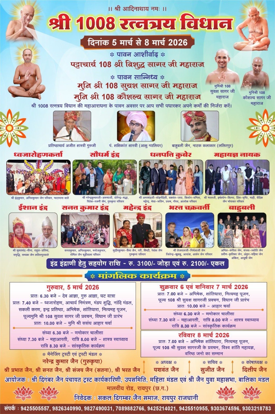 ध्वजारोहणकर्ता श्री इंद्रकुमार, अनिलकुमार जैन परिवार, भाटापारा वाले, सौधर्म इंद्र: श्री नरेंद्रकुमार -अरुणाजी, योगेश- श्रद्धा ,रितेश रजनी जैन, गुरुकृपा परिवार, धनपति कुबेर श्री अमरचंदजी सोहनी देवी, यशवंत- जया, किशोर – वनिता, महेंद्र, मेघा जतीन जी, गौरव, आलोक जैन परिवार, महायज्ञ नायक श्री भरतजी, हर्षवर्धन – शिल्पा, प्रिंस- सृष्टि, रिया,माही, वेदिक जैन